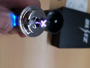 Nach dem ersten Aufladen, was mit einer kleinen LED bestätigt wird, ist das Feuerzeug auch schon einsatzbereit. Es gibt auf dem Boden des Feuerzeugs, nicht nur die Ladebuchse, sondern auch einen Ein- und Ausschalter. Den Deckel auf die Seite geklappt und den Auslöseknopf an der Seite der sehr schön leuchtet gedrückt und es kann losgehen.