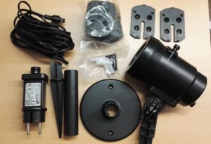 Nachdem Auspacken wurde man von zahlreichem Zubehör überrascht. Wie verschiedene Befestigungsarten und einem doch sehr langem Stromkabel (ca. 5m). Das Kabel ist an beiden Seiten wasserdicht verschraubt und so auch ohne Probleme für den Außeneinsatz geeignet. Es wurden verschiedene Schablonen ausprobiert, die man problemlos von oben in die Lampe einführt und dann mit einer Verschlussvorrichtung gegen Feuchtigkeit versiegelt. Es sind insgesamt 14 Schablonen vorhanden, die sehr viele Anlässe abdecken.