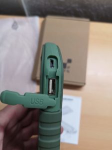 Hinter wasserdichten Verschlüssen sind 2 USB Stecker vorhanden, wo man gleichzeitig 2 Geräte auf einmal laden kann, dass sehr nützlich ist, wenn man mit mehreren unterwegs ist. Dann gibt es noch eine Öse an der Oberseite der Powerbank, wo man den mitgelieferten Haken einklinkt, um die Powerbank so zu transportieren, dass sie durch die Sonne aufgeladen wird.