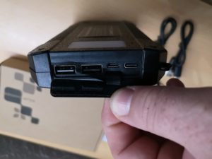 Die Anschlüsse zum Laden der Powerbank und zum Laden der Verbraucher, sind alle am Kopf der Powerbank angebracht und durch einen Gummiverschluss gegen Feuchtigkeit gesichert.