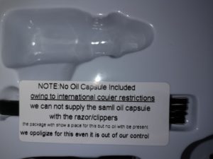 Geliefert wird der Haarschneider mit 4 Kammaufsätzen (3,6,9 und 12mm), 1 Reinigungsbürste, 1 Bedienungsanleitung, 1 Ersatz Akku sowie einem Netzteil zum Aufladen des Haarschneiders. Auf die kleine Flasche Öl was oft diesen Geräten beiliegt muss man laut Verkäufer aus dem Grunde von „Versandeinschränkungen“ verzichten und sollte man sich anderweitig besorgen. Ich habe zum Glück noch eine Flasche von dem Haarschneider, der auf dem Boden gelandet ist und werde dieses verwenden.