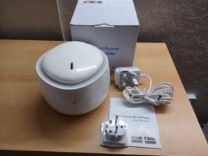 Verpackt ist der Aroma Diffusor in einem schlichten Karton, wo außer dem Gerät noch eine englischsprachige Anleitung sowie in dem Wassertank ein Netzstecker für den UK Markt untergebracht ist.