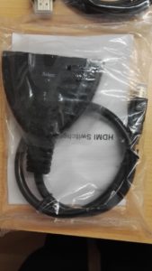 Als ich mich umgesehen habe, muss ich gestehen, habe ich mich etwas von dem Werbebild blenden lassen. Warum blenden lassen? Ganz einfach, auf dem Bild erkennt man den HDMI Switch, 3 HDMI Kabel, 4 Klettkabelbinder und einen Winkeladapter. In dem Produktkarton ist allerdings nur die 3 HDMI Kabel, der HDMI Switch und eine kleine Anleitung in mehreren Sprachen vorhanden.