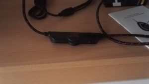 An dem Kabel ist noch eine kleine Fernbedienung vorhanden, womit man die Kopfhörerlautstärke einstellen kann, sowie das Mikrophone ein- bzw. ausschaltet.