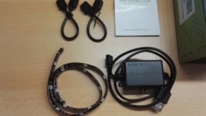 Ich bin immer wieder offen für Neues und bin auf diese LED Strips gestoßen. Allerdings wollte ich das Regal zum Beleuchten bringen und nicht den Fernseher. In der kleinen Verpackung sind 4x50cm LED Strips sowie 2 Übereck Verbinder. Diese alle separat in Antistatische Tüten verpackt. Dann befindet sich natürlich noch die Steuereinheit mit dem USB Anschluss und eine kleine Schnellanleitung in englischer Sprache dabei. Über den USB Anschluss wird das Ganze mit Strom versorgt. Die Strippen und das Steuermodul sind auf der Rückseite mit 3M Klebeband versehen, um das ganze dort wo es angebracht werden soll zu halten. Die Steuereinheit, hat zusätzlich noch eine Vorrichtung, um diese mit einem Nagel oder Schraube zu befestigen.